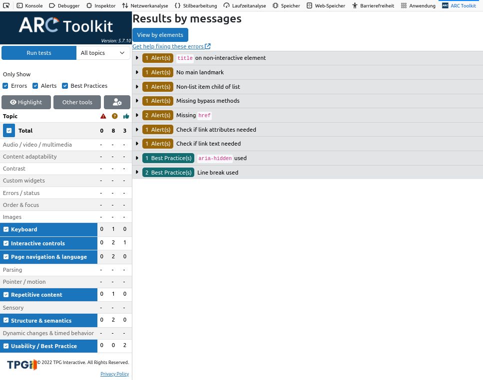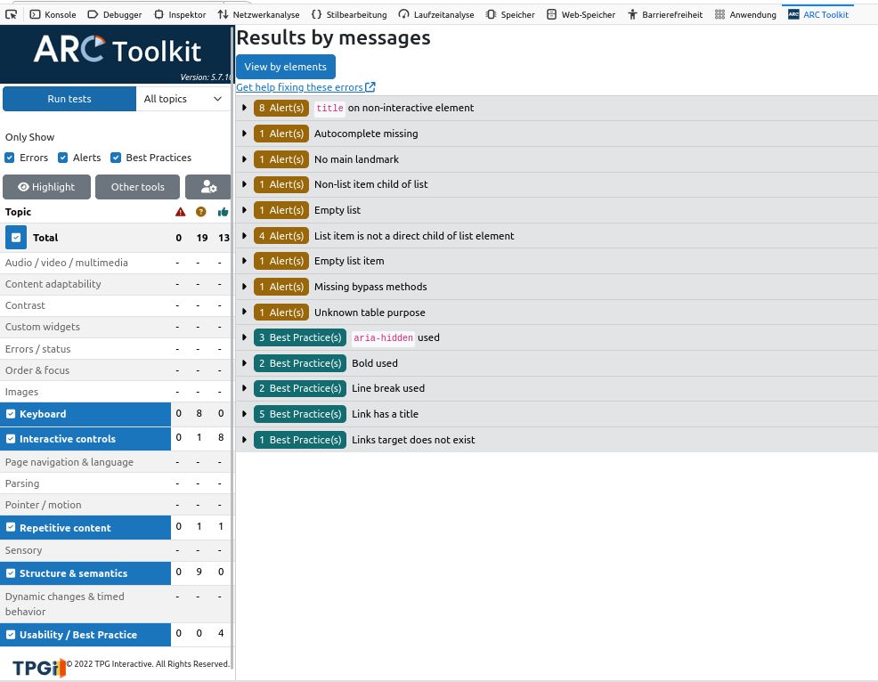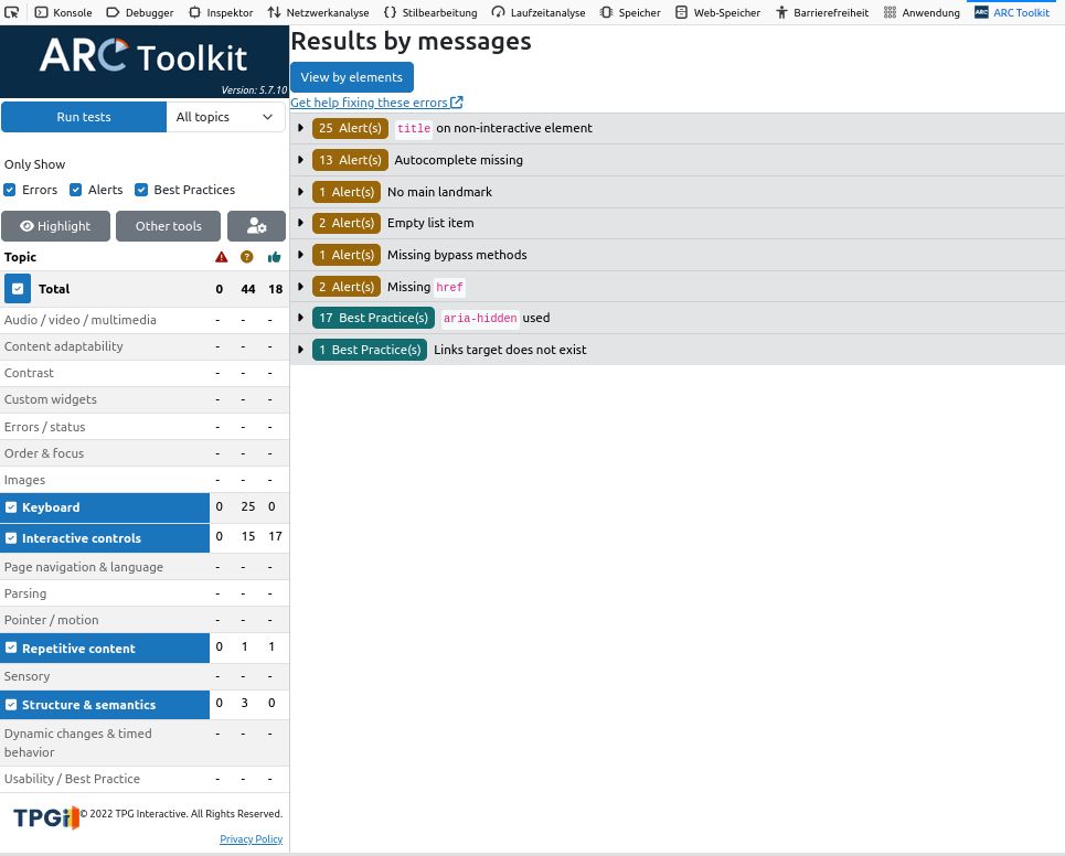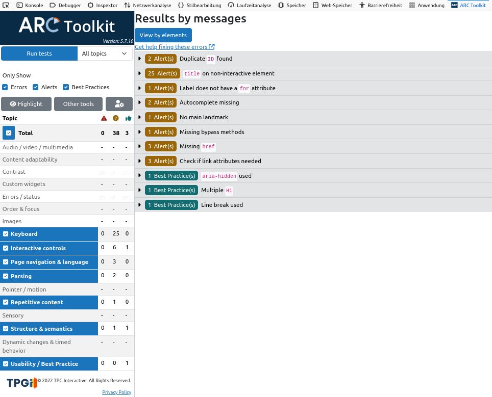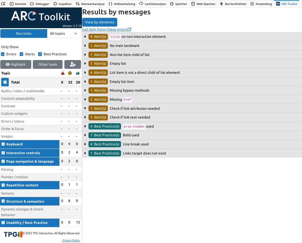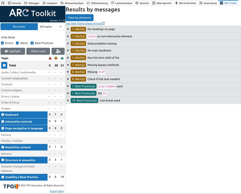 | Testergebnisse nach WCAG 2.2 gem. ARC-Toolkit (V. 5.7.10) | Login-Seite | Portlet-Seite(nach Login)