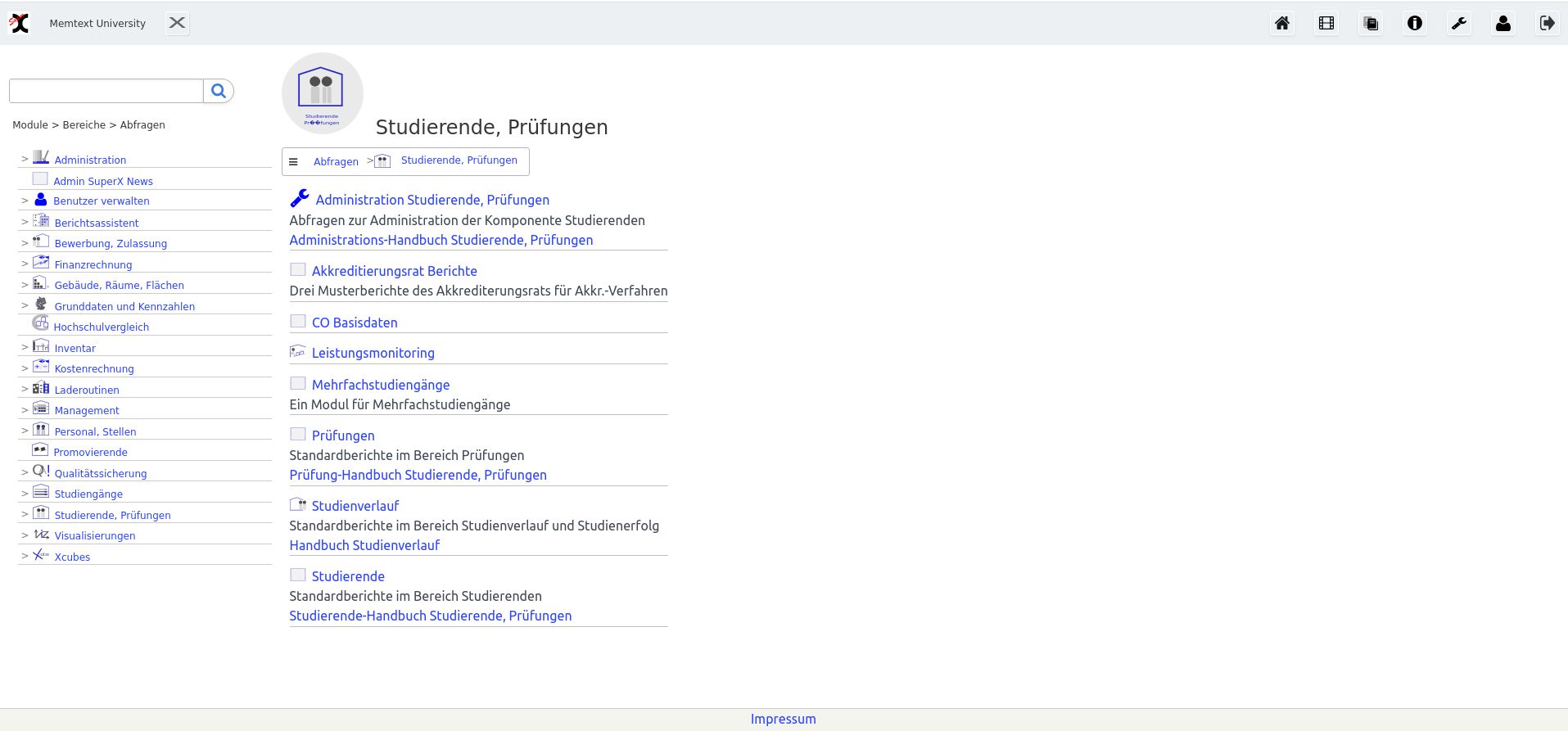 Die Funktionsweise der Oberfläche ist ausführlich in dem Benutzerhandbuch beschrieben. Für einen ersten Eindruck haben wir im folgenden eine Reihe Bildschirmabdrücke vorbereitet:Sie gelangen in ein Menü mit allen Abfragen in der SuperX-Umgebung. Wählen Sie hier eine Abfrage, z. B. Bewerbungsprozess nach Fach/Studiengang: