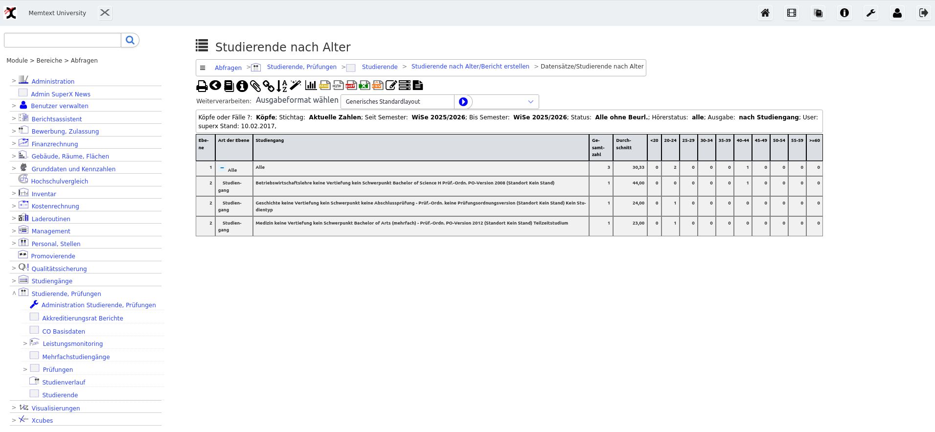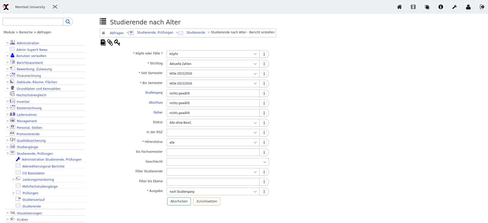 Sie können nach Installation vom Modul "XCube" im Menü "Kreuztabellen" einen Datenwürfel wählen, z.B. "Studierende Xcube"