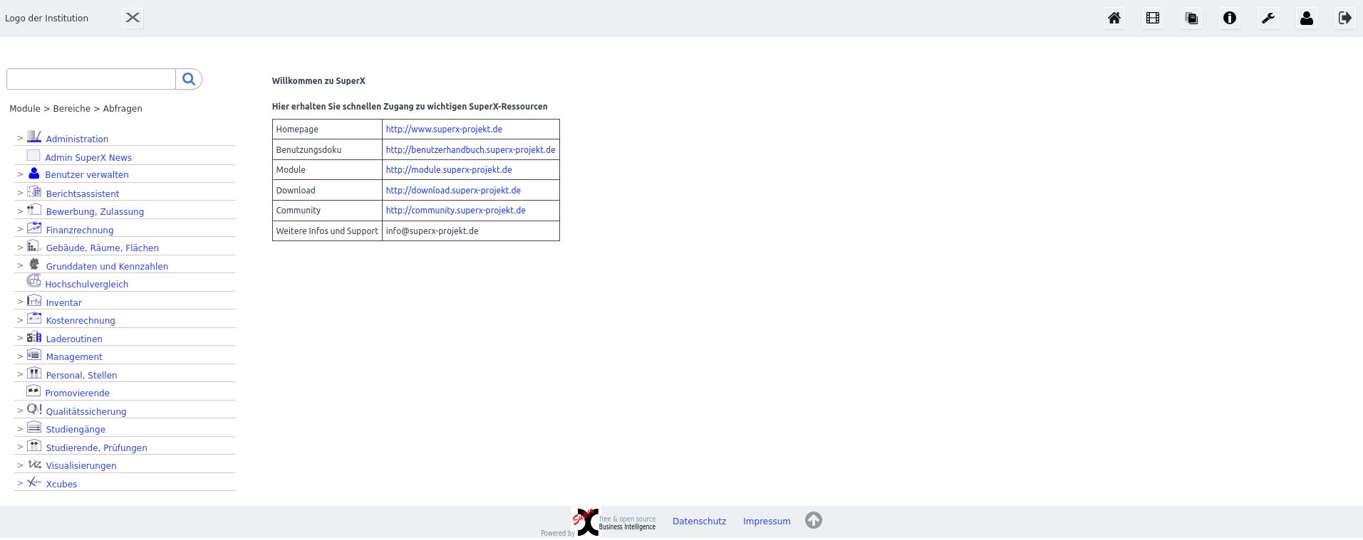 SuperX ist modular aufgebaut und kann je nach Interessen und vorhandenen Daten der Anwender eingerichtet werden. Beispielsweise können Sie nur mit KLR-Abfragen oder Studierendenzahlen beginnen und SuperX später bei Bedarf um andere Bereiche wie Personal/Stellen, Kennzahlen oder Gebäude / Fächen erweitern. Auch die Hardware kann je nach Bedürfnissen gestaltet werden. Die folgenden Webseiten informieren über allgemeine Installationsschritte und Voraussetzungen. Eine detaillierte, eher technisch orientierte Installationsanleitung finden Sie im Administrationshandbuch.