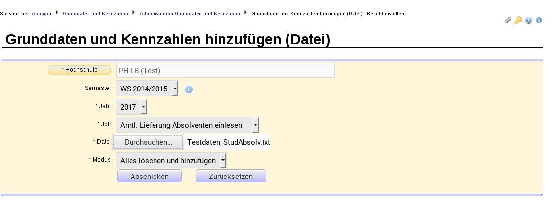 Zum Upload gehen Sie in das Menü Grunddaten und Kennzahlen -> Administration Grunddaten und Kennzahlen -> Grunddaten und Kennzahlen hinzufügen (Datei)