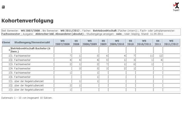 Die Auswahl "Abbrecher inkl. Abwanderer" bedeutet, daß die Studierenden, die den Studiengang verlassen haben und in einen anderen Studiengang gewechselt haben, und dann ohne Abschluss das Studium beendet haben, hier gezählt werden. Wenn Sie "Abbrecher ohne Abwanderer" wählen, dann werden nur die Studierenden gezählt, die den Studiengang nicht gewechselt haben und dann das Studium beendet haben.