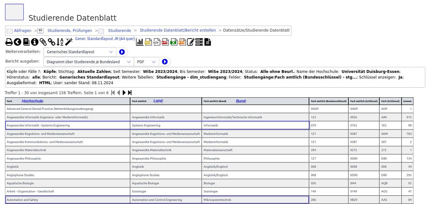 Endlich möglich: Hochschul-, Landes- und Bundesschlüssel auf einen Blick nebeneinander.