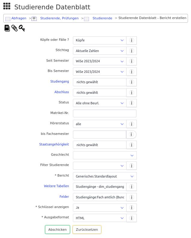 zur Zuordnung und Gruppierung von Abschlüssen: Studiengänge:Abschlussgruppe gruppiert - abschluss_grp_str Studiengänge:Abschlussgruppe gruppiert (Schlüssel) - abschluss_grp Studiengänge:Abschluss amtlich (Bund) - abschluss _astat_bund_str Studiengänge:Abschluss amtlich (Bundesschlüssel) - abschluss _astat_bund Studiengänge:Abschluss amtlich - abschl_astat_str Studiengänge:Abschluss amtlich (schlüssel)- abschl_astat Studiengänge:Abschluss (intern) - abschluss_str Studiengänge:Abschluss (intern)(Schluessel) - abschluss zur Zuordnung und Gruppierung von Fächern: Studiengänge:Fächergruppe amtlich - stg_astgrp Studiengänge:Fächergruppe amtlich (Schlüssel) - stg_astgrp_str Studiengänge:Fach amtlich (Bundeschlüssel) - stg_astat_bund Studiengänge:Fach amtlich (Bund) - stg_astat_bund_str Studiengänge:Fach amtlich - stg_astat_str Studiengänge:Fach amtlich (Schlüssel) - stg_astat Studiengänge:Fach - stg_str Studiengänge:Fach (Schluessel) - stg zur Summenbildung: Studierendenstatistik:Summe - summe