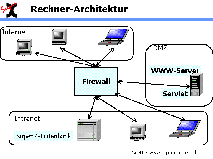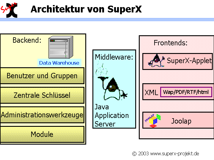 Das Data Warehouse ist modular aufgebaut. SuperX besteht aus einem Datenbank-Server, einem Servlet-Container (Tomcat) und mehreren eigens entwickelten Java-Frontends.