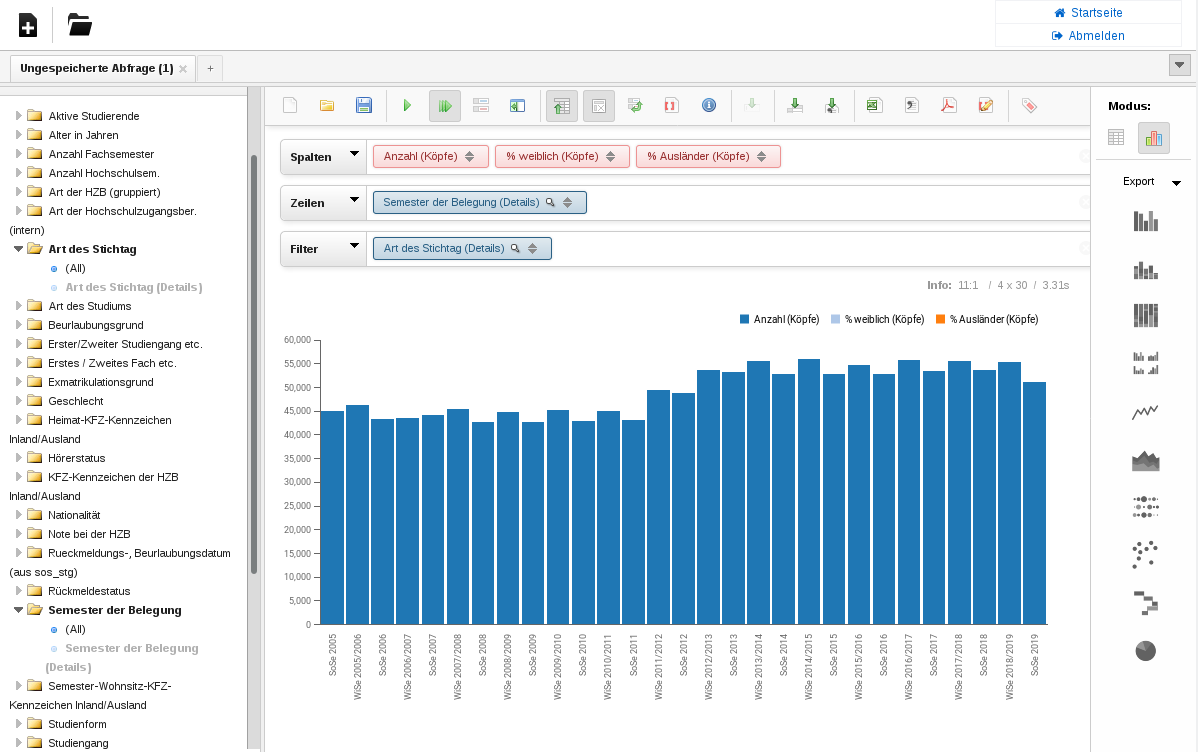 Anhand von Standardberichten, Datenblättern und speziellen Auswertungsmöglichkeiten können diese Fragen auf der Basis der Daten Ihrer Hochschule beantwortet werden.