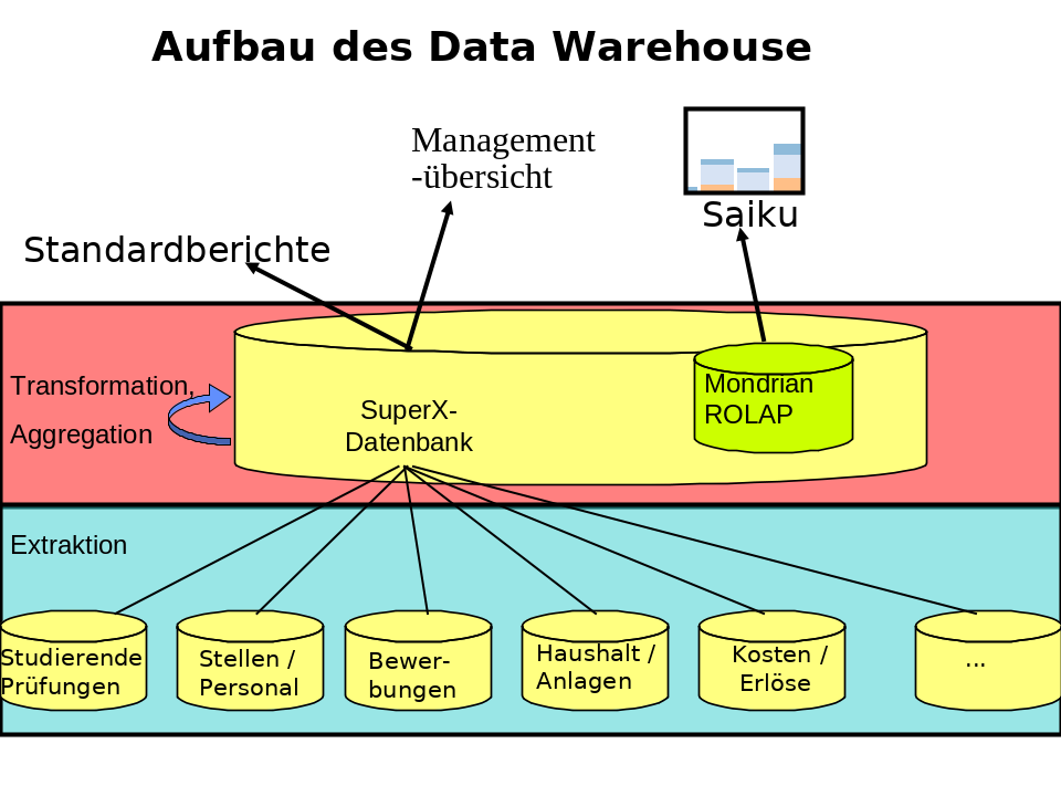 BI/SuperX besteht aus einem Datenbank-Server und eigens entwickelten Clientanwendungen. Durch Übernahme- und Transformationsskripte werden Daten aus den verschiedensten Quellen, z. B. der Studierenden-Verwaltung CAMPUSonline, im vordefinierten Rhythmus (z. B. jede Nacht) in die SuperX-Datenbank übernommen.