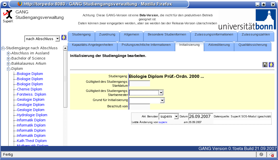 Die Maske, mit der Sie vermutlich am meisten arbeiten werden, lautet Studiengang suchen und bearbeiten und befindet sich im Themenbaum unter dem Menüpunkt "Studiengänge".