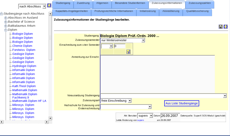 Der unterste Punkt Studiengang das Infosystem (lehr_stg_ab) ist nur für Hochschulen gedacht, die diese Zuordnung manuell anpassen wollen. In der Regel ist dies unnötig, denn dies wird automatisch gemacht, wenn die Datenquelle für die Studiengänge das Infosystem ist.