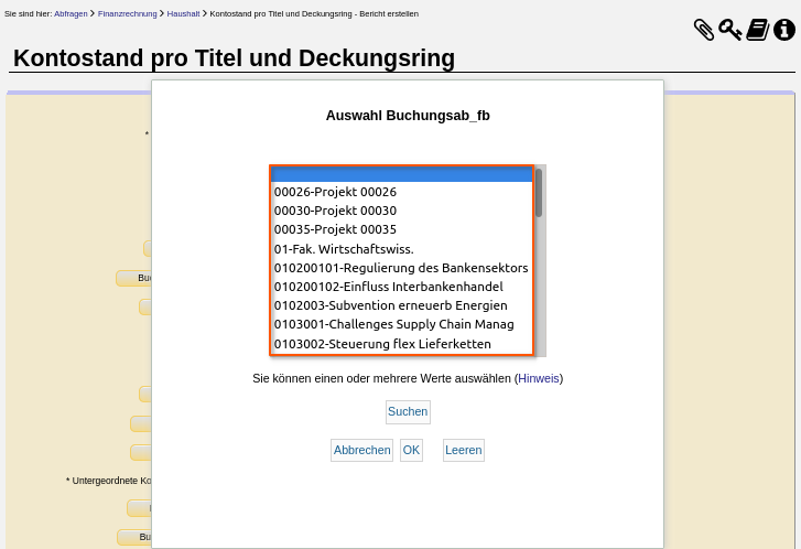 Über den Button "Buchungsabschnitt/Fachbereich" (hier: Buchungsab_fb) wurde die sehr umfangreiche Auswahliste zur Anzeige gebracht.