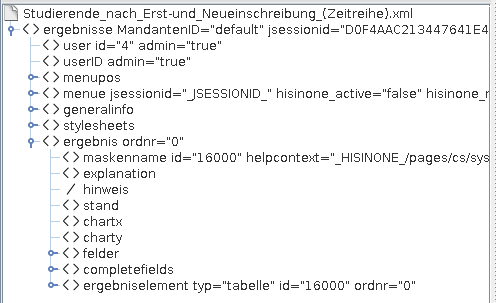 Die Ergebnistabelle ist hierarchisch strukturiert, unterhalb des Root-Elements sind 1-n ergebnis-Elemente verfügbar. Das Element felder enthält jene Felder, welcher für die Selektion genutzt wurden. Das Element completefields enthält alle Felder der jeweiligen Auswahlmaske: