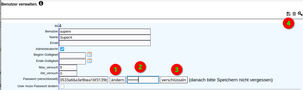 In der Bearbeitungsmaske können Sie Kennung und Namen ändern, sowie das Passwort ändern. Danach müssen Sie oben rechts auf die Diskette zum Speichern klicken.