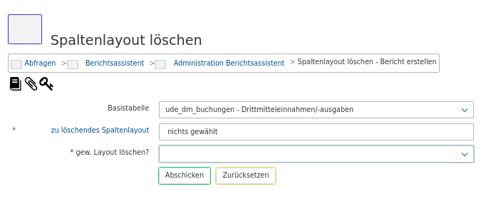 Nach Login mit einer Admin-Kennung haben Sie Zugriff auf das Menü Abfragen - Berichtsassistent - Administration Berichtsassistent, dort die Maske Spalten und Spaltenlayouts verwalten: