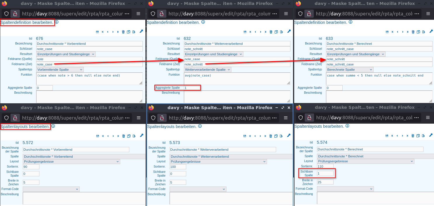 Die Vorbereitende Spalte beinhaltet eine case-when-Bedingung, damit bspw. unbekannte Noten (note=8) rausgefiltert werden. Der Feldname (Quelle) kann leer bleiben. Der Feldname (Ziel) muss gefüllt werden. Bei der Weiterverarbeitenden Spalte wird als Feldname (Quelle) der Feldname (Ziel) der Vorbereitenden Spalte eingetragen. Das Merkmal Aggregierte Spalte wird auf 1 gesetzt und die gewünscht Funktion eingetragen. Es folgt die Berechnete Spalte, welche als Feldname (Quelle) den Feldname (Ziel) der Weiterverarbeitenden Spalte bekommt. Die Funktion sorgt dafür, dass der Notenschnitt nur dann ausgegeben wird, wenn mindestens 5 Prüfungen vorhanden sind. Es wird das Merkmal Sichtbare Spalte auf 1 gesetzt, damit die Ausgabe in der Ergebnistabelle erfolgt.