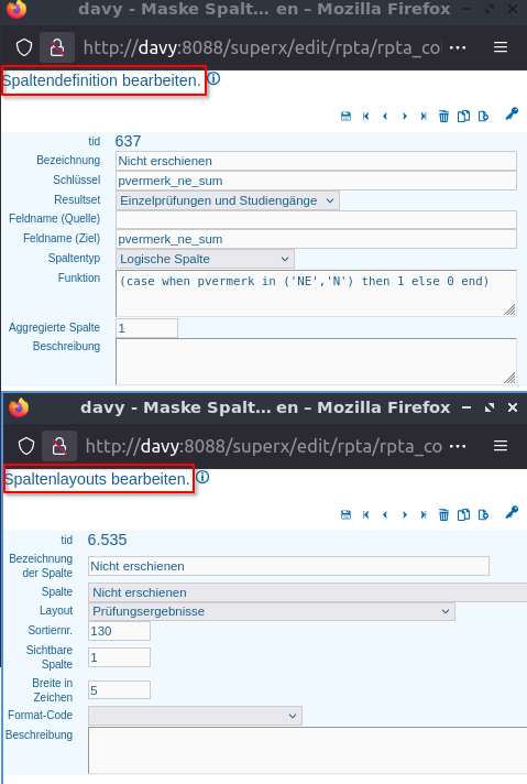 kann durch den Stift eine Bearbeitungsseite aufgerufen werden. Hier können - wie bereits unter spaltenlayout verwalten erklärt - alle Felder geändert und Spalten gelöscht werden. Man muss da natürlich bei berechneten Spalten darauf achten, diese bei Löschungen anzupassen!