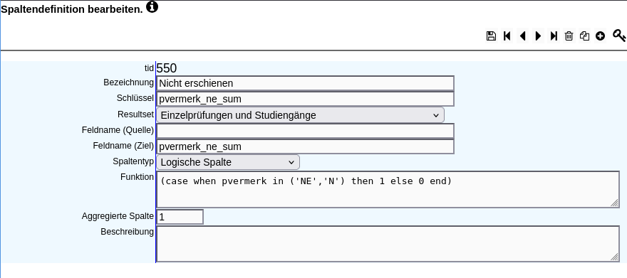 In der Funktion wird eine case-when-Bedingung angelegt, um die richtigen Prüfungsvermerke zu filtern. Außerdem wird das Merkmal Aggregierte Spalte auf 1 gesetzt. Für eine logische Spalte bedeutet das, dass summiert wird. Damit die Summe in der Ergebnistabelle erscheint, wird das Merkmal Sichtbare Spalte auf 1 gesetzt.