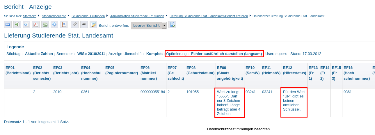 Die Abfrage liefert Studierende Statistik Landesamt. Neben den üblichen Einschränkungen kann zu den Formellen Überschriften in der Auswahl "Anzeige Überschrift" auch Sprechende Überschriften ergänzt werden. In der Auswahl "Optimierung" kann gewählt werden, ob in der Ergebnistabelle Informationen zu fehlendem astat oder zu Langen Werten angegeben werden sollen. Ohne Ausgabe dieser Informationen läuft der Bericht wesentlich schneller.