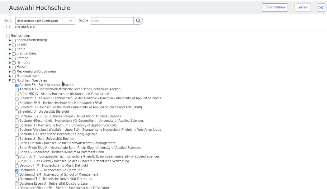 - "Übernehmen-Button": Übertragen Sie damit die markierten Hochschulen in den Berichtsauftrag.