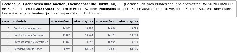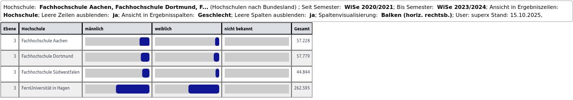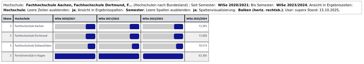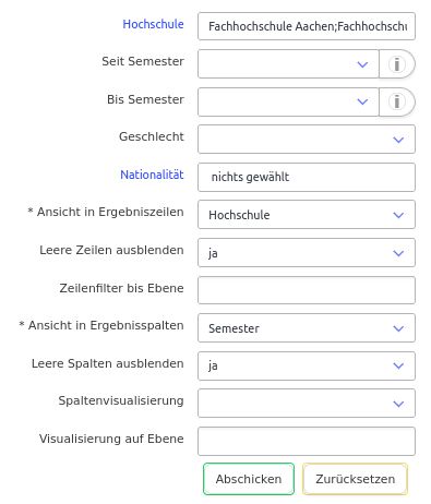 - "Ansicht in Ergebnisspalten" bzw. "Ansicht in Ergebniszeilen": Auswahl steuert, ob die Werte der einbezogenen Hochschulen einzeln spalten- oder zeilenweise ausgegeben werden.
