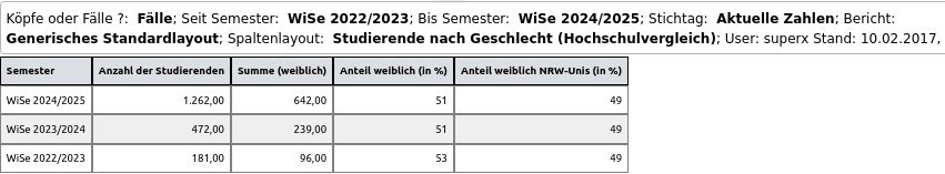 Schicken Sie den Berichtsauftrag ab, und nehmen Sie im erzeugten Bericht den Vergleich der eigenen Hochschuldaten mit denen der Vergleichshochschulen/-gruppe(n) vor. Es folgen drei Beispiele, die sich lediglich im gewählten Spaltenlayout (s.o.) unterscheiden.