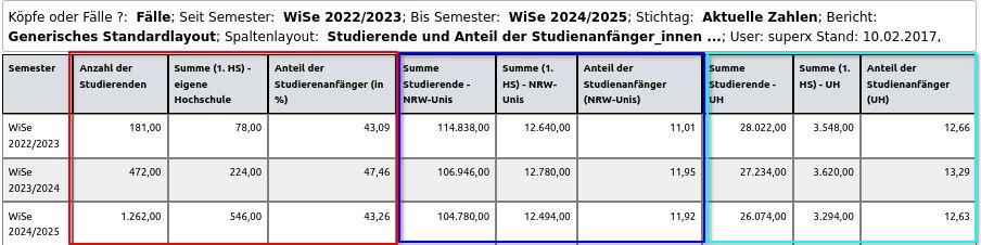 Abb.: Studierendendaten-Vergleich im Detail (roter Rahmen: eigene Hochschule, blauer und türkiser Rahmen: Vergleichshochschulen)