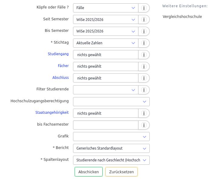 Die Abfrage ermöglicht den Datenabruf für die eigene und eine oder mehrere Vergleichshochschulen. Sie bietet den direkten Datenvergleich über unterschiedliche Berichtsspalten. Gehen Sie für Ihre Vergleichsaktivität in folgenden Schritten vor: