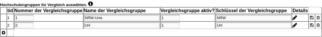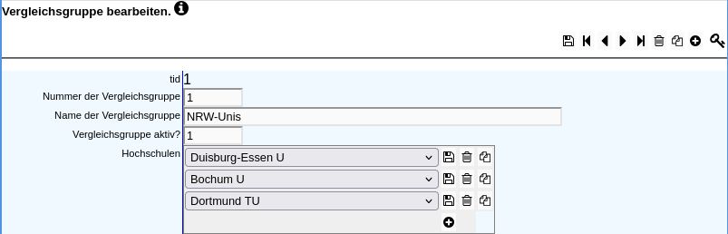 - "Stift-Icon": Wechseln Sie damit in den nächsten Dialog, wo die Zuordnung von 1-n Vergleichhochschule(n) zur angelegten Vergleichsgruppe erfolgt.