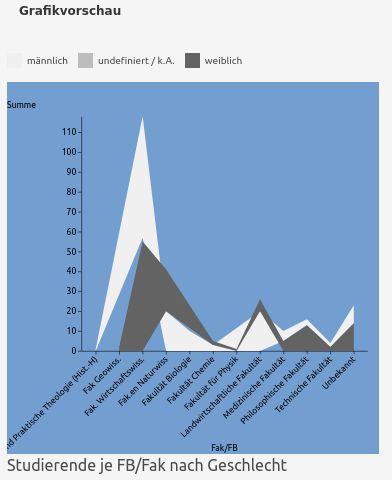 Beispiel: Als Datenbasis wurde der Standardbericht "Studierende Datenblatt" mit zusätzlicher Tabelle "Studiengänge" und weiteren Feldern "Fak/FB", "Geschlecht", "Summe" herangezogen. Durch Definition des Grafikelementes "Fläche (vertikal)" wie unten abgebildet und Anpassung der Layoutmerkmale "Außenrand links", "Außenrand oben", "Außenrand unten", "Hintergrundfarbe", "X-Label", "Y-Label", "X-Schriftneigung", "Farbschema" und "Legende" erhält die Grafik das in der Vorschau dargestellte Layout.